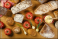 Fototapeta - Chleby, pomidory i cebulki - kompozycja na drewnianym stole