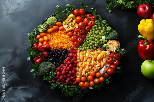 Fototapeta - Jaskrawy, okrągły układ owoców, warzyw i makaronu, ułożonych w sekcjach na ciemnym, teksturowanym tle.