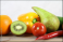 Fototapeta - Zdrowa żywność - owoce i warzywa na drwenianej podstawie i jasnym tle