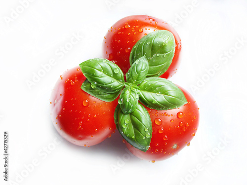 Fototapeta - bazylia z kroplami wody i pomidorami na białym tle