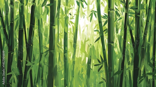 Fototapeta - Lush green bamboo forest scene with vibrant light.