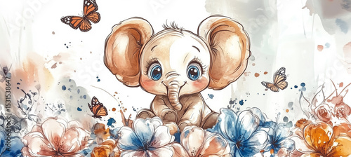 Fototapeta - Uroczy, mały słonik z dużymi uszami i niebieskimi oczami, siedzący w bajkowym ogrodzie pełnym kwiatów i motyli, namalowany w stylu akwareli.