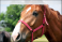 Fototapeta - Portret brązowego konia z czerwoną uzdą.