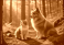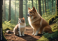 Fototapeta - Bury kot i pies na spacerze w lesie obserwują coś w oddali, piękny portret zwierząt