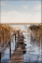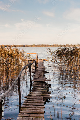 Fototapeta - Drewniany pomost nad jeziorem, mglisty poranek nad jeziorem z pomostem, ławeczka nad jeziorem, wschód słońca nad jeziorem z pomostem