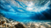 Fototapeta - Artystyczne ujęcie fal pod wodą, ukazujące głębię i nieprzeniknioną przestrzeń Atlantyku. Niebieska tonacja wody i delikatne bąbelki powietrza wprowadzają atmosferę spokoju i tajemniczości.