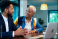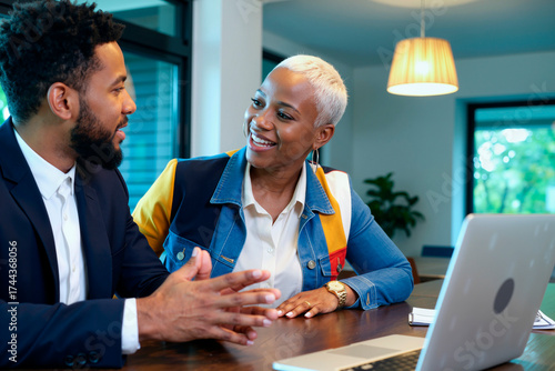 >Naklejka>Tematy>Young adult Black man and young adult Black woman sitting at table discussing business strategy, smiling and making eye contact, open laptop and documents visible in modern office setting