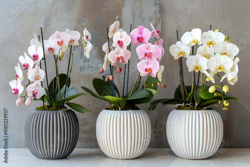 Eleganckie doniczki z pięknymi orchideami w odcieniach bieli i różu, ustawione w harmonijnej kompozycji na tle neutralnej ściany.