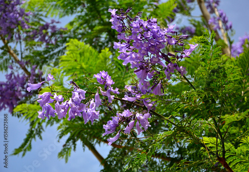 >Naklejka>Tematy>Kwiaty>kwitnąca jakaranda, fioletowe kwiaty drzewa jakaranda, jakaranda mimozolistna, Jacaranda mimosifolia, branch of jacaranda purple flowers tree, blossoming Jacaranda, flowers of a jacaranda tree