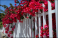 Roslinność Majorki, czerwone kwiaty bugenwilli wystają zza białego parkanu