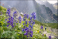 Fototapeta - Dzikie niebieskie kwiaty ostróżki kwitną na zboczu góry w Tatrach wśród skał w promieniach Słońca a w tle wysokie góry.