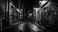 wet city street after rain at night time with colorful light and graffiti wall, Generative Ai