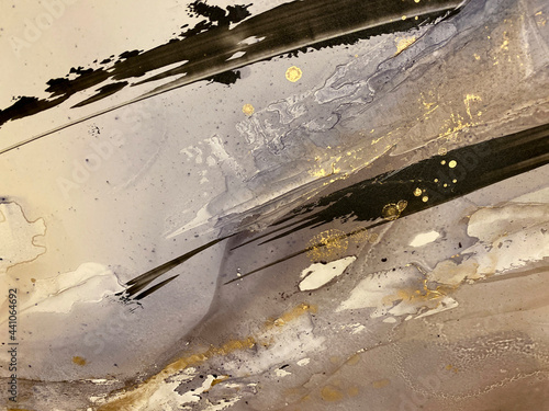 Fototapeta - Abstract vanilla background with gold and grey — beautiful brush strokes, smears and gold spots. Fragment of modern painting with beige and grey texture resembles watercolor or aquarelle painting.