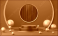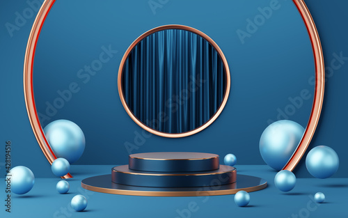>Naklejka>Tematy>3D>Empty blue and black cylinder podium with copper border, ball on gold circle arch, curtain background. Abstract minimal studio geometric shape. Pedestal mockup space for product design. 3d rendering.