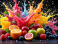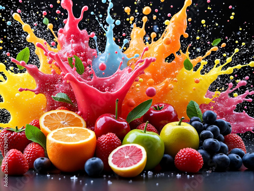 Cinematic food photography variety of fruits splashing representing healthy real fruit juice