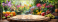 Fototapeta - A wooden table with fruits and vegetables, surrounded by colorful flowers in the background