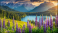 Fototapeta - Fioletowy łubin nad jeziorem w górach, krajobraz