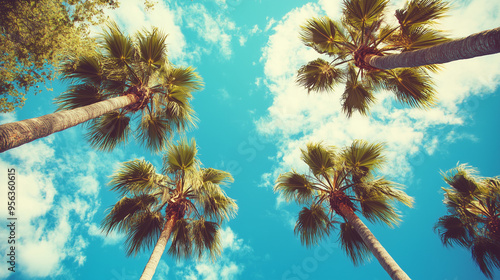 Fototapeta - Niebieskie niebo i palmy widziane z perspektywy od dołu w stylu retro. Klasyczne, letnie tło, które idealnie pasuje do tematów związanych z plażą, tropikalnymi wakacjami i podróżami.