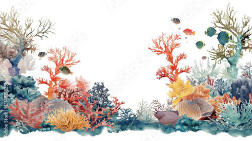 Fototapeta - Colorful coral reef and tropical fish swimming on transparent background