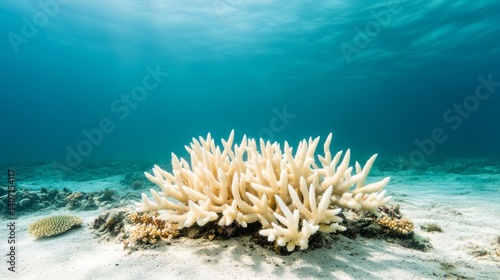 Dead coral reef under murky water, climate change damage, underwater landscape