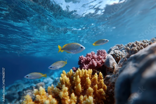 Fototapeta - Underwater scene of tropical fish swimming above colorful coral reefs in crystal-clear blue water