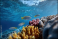 Underwater scene of tropical fish swimming above colorful coral reefs in crystal-clear blue water
