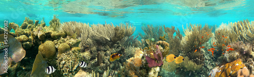 Fototapeta - Colorful coral reef with many fishes and sea turtle. The people at snorkeling underwater tour at the Caribbean Sea at Honeymoon Beach on St. Thomas, USVI
