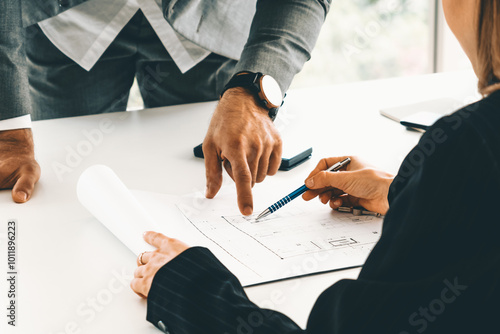Fototapeta - Architect and engineer working with construction drawing project on table in office. Architecture and engineering business concept. uds
