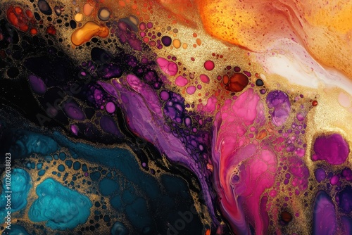 Fototapeta - Dynamic hues, spinning metallic designs, and colorful splashes shape the landscape of these fluid textures. Natural sophistication in abstract liquid ink creations