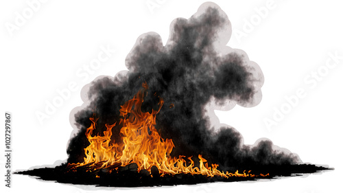 >Naklejka na meble>Ognisko z którego wydobywa się czarny dym na białym tle, gęsty czarny dym i ogień, gęsty czarny dym, buchający gęsty czarny dym, z ogniem i czarnym dymem, wyodrębniony z tła