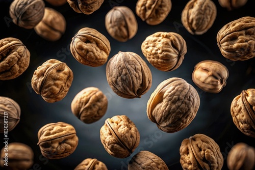 Fototapeta - Experience the mesmerizing levitation of walnuts in their shells against a transparent backdrop, offering stunning visuals that celebrate nature's exquisite design and creativity.