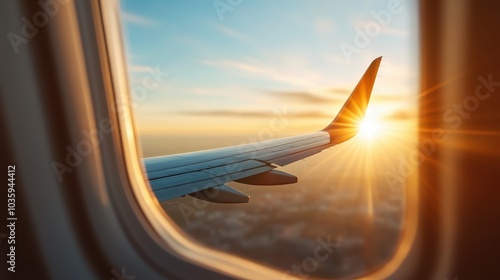 Fototapeta - The wing of an airplane is captured during a radiant sunset flight, providing a spectacular view of the horizon painted with the breathtaking colors of dusk.