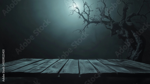 Fototapeta - Stary, zużyty drewniany stół z wyraźnymi śladami użytkowania zajmuje centralne miejsce w mrocznej scenerii.