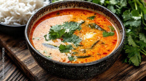 Fototapeta - Würzige Schüssel würzige Rasam-Suppe mit Reis für eine kulinarische Entdeckungsreise