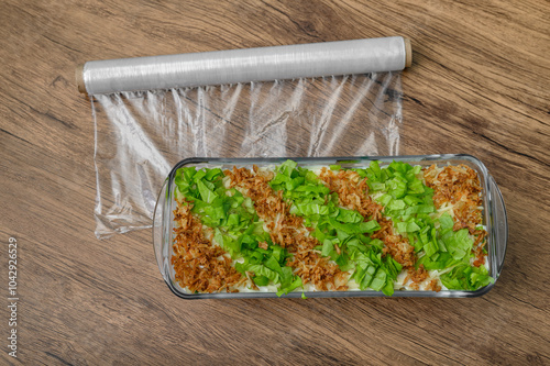 Fototapeta - Folia spożywcza w rolce i sałatka na imprezę, przechowywanie żywności