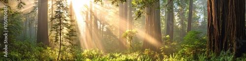 Fototapeta - Misty morning forest with tall redwood trees, sunlight filtering through the canopy, creating golden beams, Realism, Soft greens and golds, Peaceful mood