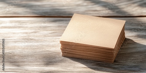 Fototapeta - Stack of blank notes on a rustic wooden table, captured with soft lighting.