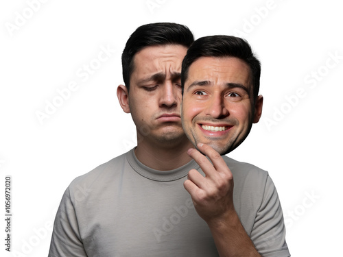 Fototapeta - Man Holding a Smiling Mask Revealing True Sadness Behind the Facade