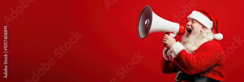 Święty Mikołaj krzyczący przez megafon na jednolitym czerwonym tle z miejscem na tekst