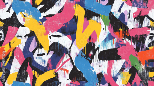 Tło z ciągłym wzorem przedstawia bogaty krajobraz miejskiego graffiti, wypełniony żywymi kolorami i kreatywnymi tagami.