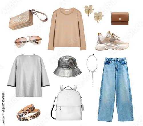 Female clothes set isolated on white, outfit.Jeans and tops. Collection of trendy clothing