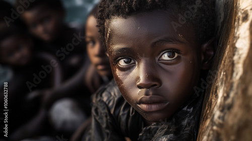 >Naklejka na meble>Młode twarze afrykańskich dzieci i nastolatków, zróżnicowane pod względem wieku i wyglądu, ukazują ich wspólne marzenie o lepszym życiu w Europie.