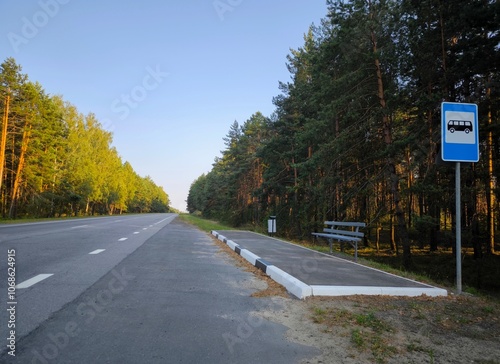A color photo of a bus stop on a rural road. Bus stop in the middle of the forest
