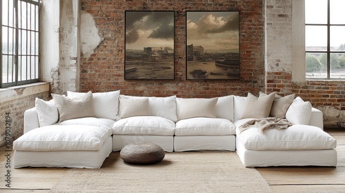 Fototapeta - White sectional sofa in modern living room with brick wall and two framed landscape pictures.