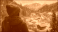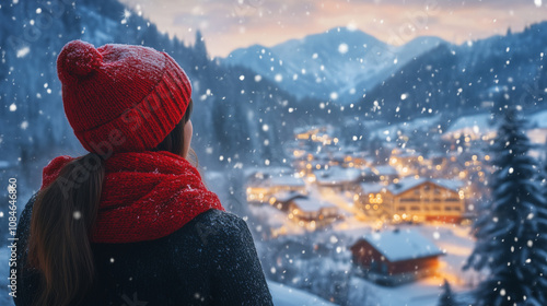 Fototapeta - Kobieta w czerwonym szaliku i czapce stoi na skraju zaśnieżonej wioski górskiej o zmierzchu, podziwiając magiczną scenerię.
