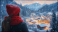 Kobieta w czerwonym szaliku i czapce stoi na skraju zaśnieżonej wioski górskiej o zmierzchu, podziwiając magiczną scenerię.