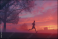 Biegacz w ruchu podczas porannego lub wieczornego treningu na tle malowniczego nieba w odcieniach różu, fioletu i pomarańczy.