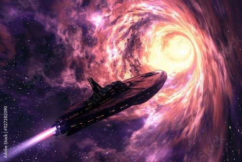 Fototapeta - Spaceship traveling through a vibrant cosmic wormhole in an expansive universe filled with bright stars and swirling galaxies