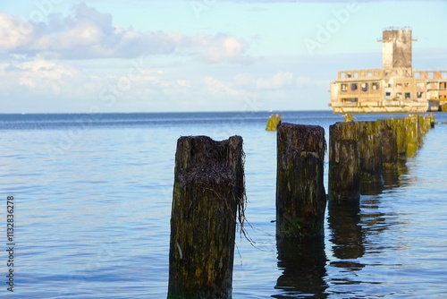 Fototapeta - Falochron służący do ochrony wybrzeża. Solidny falochron na pierwszym planie, a w tle forteca.
