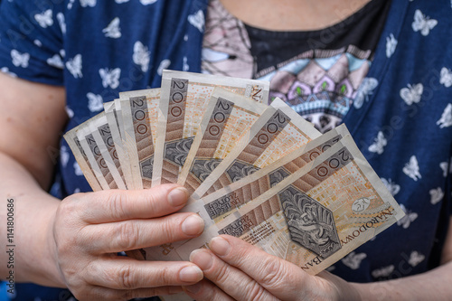Fototapeta - Polskie pieniądze wachlarz gotówki pln z bliska w dłoniach seniorki